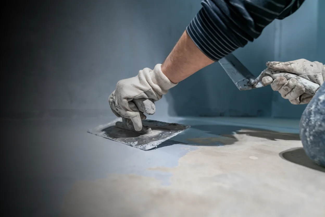 Нанесите материал равномерным слоем (толщина обычно 1–3 мм) кистью, валиком или шпателем.
